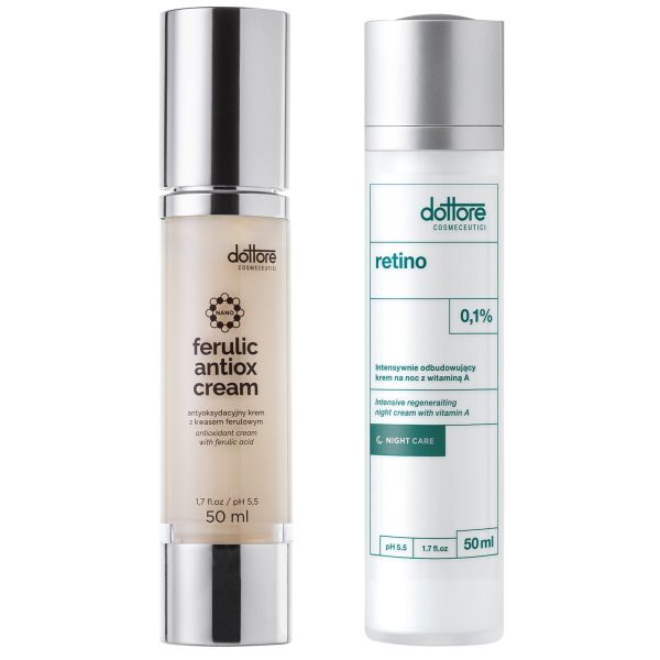 Antyoksydacyjna kuracja odbudowująca skórę twarzy jest dedykowana do pielęgnacji skóry narażonej na działanie wolnych rodników i starzejącej się. Zestaw kosmetyków do pielęgnacji to połączenie kremu na dzień z kwasem ferulowym oraz kremu na noc z różnymi rodzajami retinoidów.