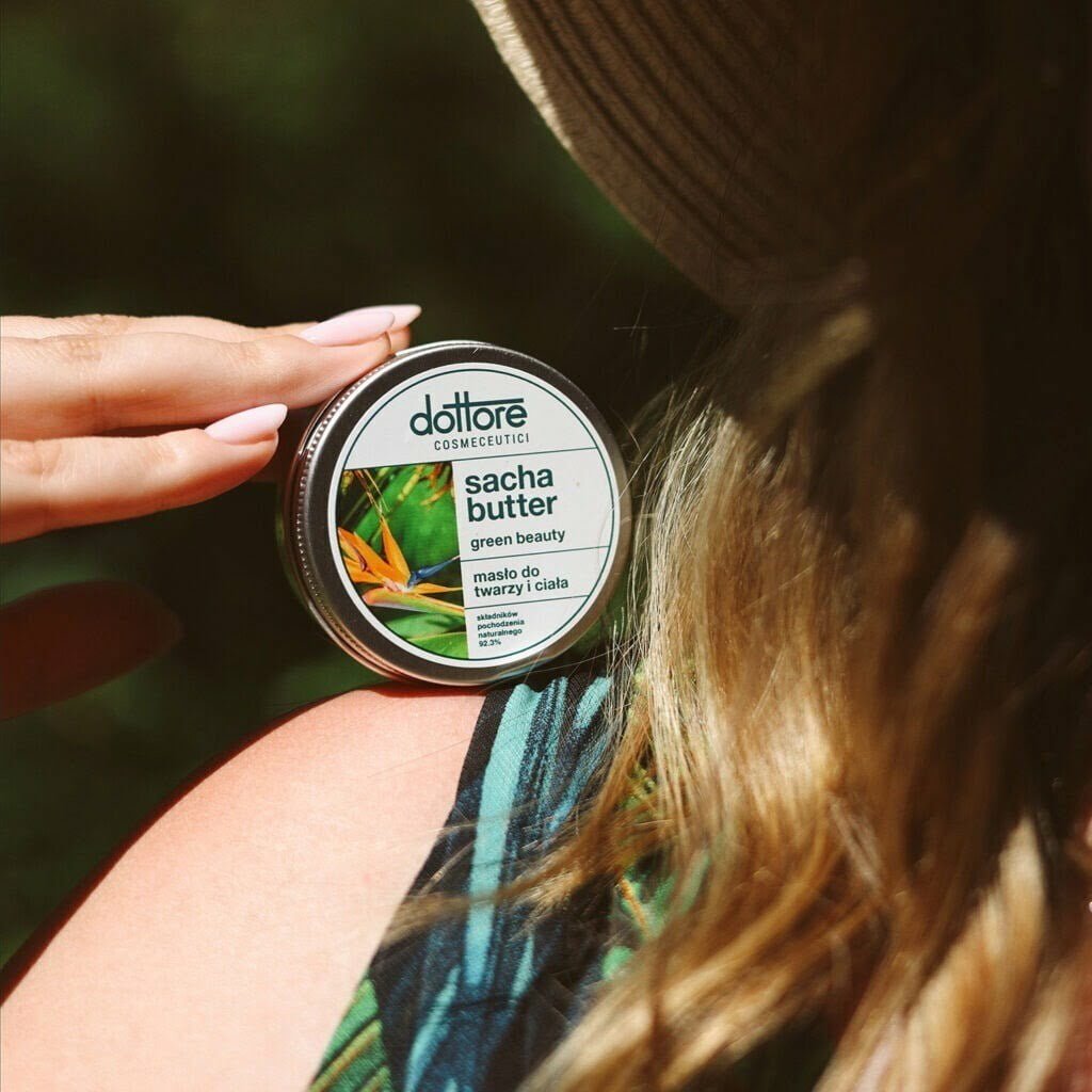 Receptura masła opiera się na oleju Sacha Inchi, znanym również jako Inca Inchi Oil. Jest cennym olejem roślinnym pozyskiwanym z nasion rośliny Plukenetia volubilis, która występuje w Amazonii. Ten olej jest ceniony ze względu na swoje liczne właściwości zdrowotne i pielęgnacyjne. Jest doskonałym źródłem składników odżywczych, takich jak nienasycone kwasy tłuszczowe NNKT, w tym kwas omega-3, -6 i -9. Są one niezbędne dla zdrowia i dobrze funkcjonującej skóry. Jest lekki, niekomedogenny, łatwo się wchłania i doskonale nawilża skórę. Działa jako skuteczny emolient, tworząc na skórze delikatną warstwę ochronną.