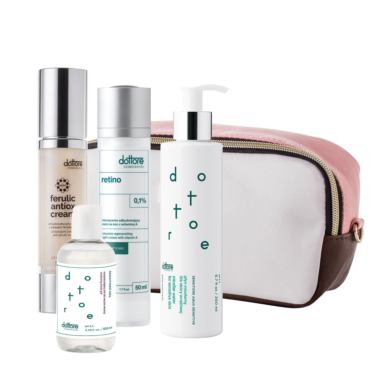 Zestaw prezentowy zawiera kompleksową pielęgnację na dzień i na noc oraz produkt do demakijażu. Kosmetyki zostały zapakowane w elegancką kosmetyczkę, która pomieści niezbędne produkty pielęgnacyjne. Dodatkowo gel oczyszczający sensitore gel do mycia twarzy dodaliśmy w prezencie.